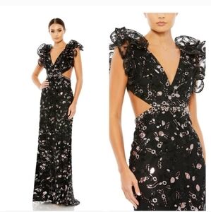 Capture that striking presence and get everyones attention in Mac Duggal 68043. In a dress that was intended to be seen and adored after, transform the dance floor into your very own catwalk. This eye-catching dress features cutouts that show off the skin, strong curlicue sleeves, and floral-patterned sequins. The open center and lattice lacing on the back give the appearance of a two-piece. This Mac Duggal 68043 will definitely make you feel special! Model is wearing Black/Pink color.etails: Sleeveless, Ruffles, Sequins, Cutouts, Deep neckline, Fitted bodice, Open back, Strappy, Floor length, Sweep train