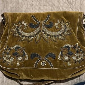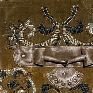 Stylish tan shoulder bag with intricate embroidery. Perfect for adding a touch of elegance to any outfit.