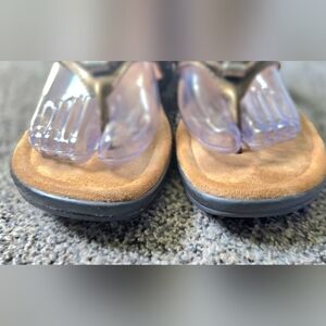 The Minnetonka Silverthrone Women's Flip Flop Sandals in size 8 feature a stylish design with a silver color and Aztec tribal theme. Made with leather material, these sandals are perfect for adding a touch of western flair to your outfit. The comfortable flip flop style makes them ideal for casual wear, while the intricate details and quality construction reflect the brand's reputation. Perfect for adding a unique and stylish touch to your summer wardrobe. good pre-owned condition