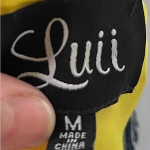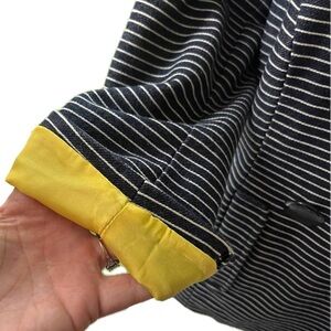 Chic and stylish Luii women’s jacket in a timeless black-and-white horizontal stripe pattern. Features a double-breasted front with oversized buttons, a wide collar, and a flattering boxy silhouette. Fully lined with a bold yellow polyester interior for a pop of color. A perfect transitional piece for spring or fall!