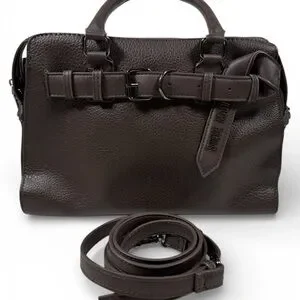 Key Details : Front buckle/belt features, top handles, a hanging logo strap, and includes a removable crossbody strap