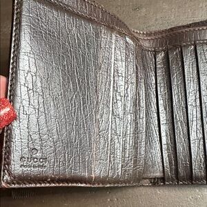 Good condition, fair wear from daily use, one call out on the outside corner, see pictures, Gucci wallet with signature monogram. Features leather tab closure.