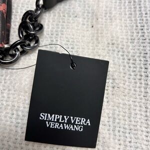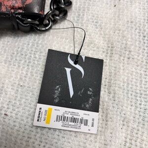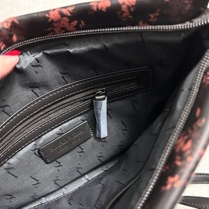 This back is black and brown. It has a flower pattern . It has a long strap and part of it a chain. It had the logo in the front in metal. It also has a zipper pocket in front and an open pocket on the other side . It has a zipper pocket inside and 2 open pockets on the other side.