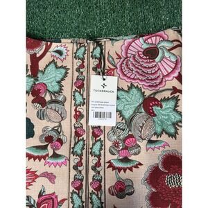 A Tuckernuck A-line skirt in a captivating garden scene print. This skirt showcases a charming floral motif on a neutral beige background, complemented by a decorative striped trim along the center front. The design offers a flattering silhouette perfect for versatile styling.
