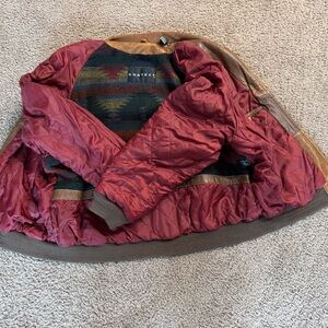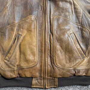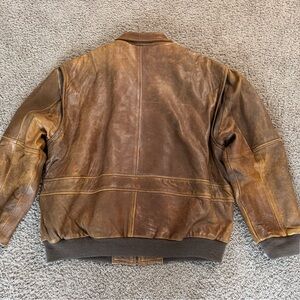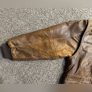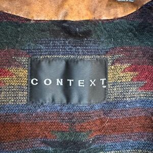 A vintage Context brown leather bomber jacket with a vibrant, multi-colored red and black Aztec/Southwestern pattern. This jacket is. generally from the late 1980s.