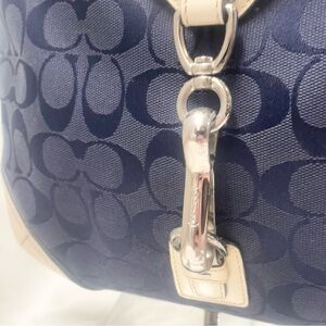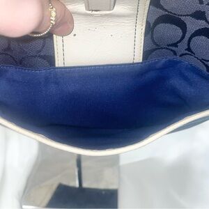 Blue signature jacquard canvas and white leather, silver tone hardware, iconic Hampton large Coach engraved clip flap closure. Blue interior with multifunctional pockets and zip. Open back pocket