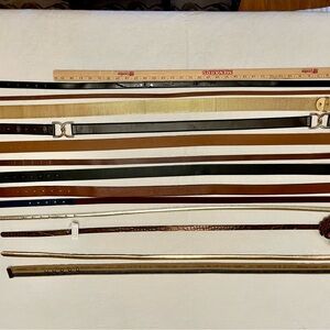 Women’s belt bundle featuring sixteen different styles. Thirteen buckled belts range in length from 45” to 50”. Three stretch belts extend 36” or 40”.
