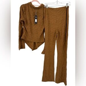 Fashion Nova NWT Liliana Brown Textured Pant Set Ruched Button Top Flare Pants