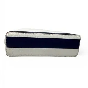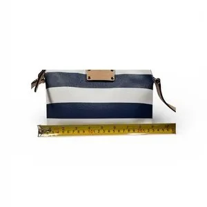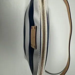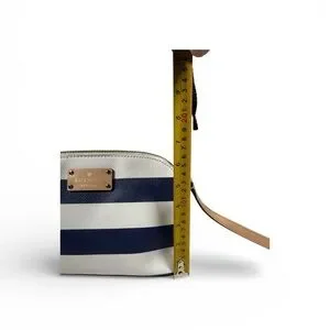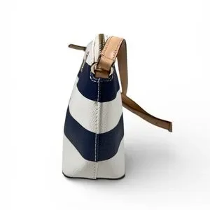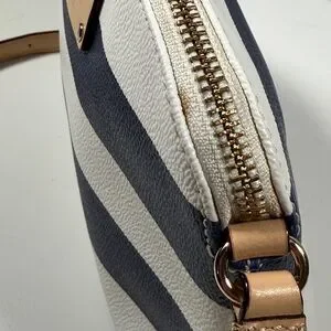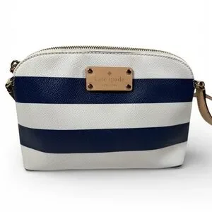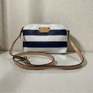 Kate Spade New York Wellesley Printed Hanna Crossbody bag. It is made of leather with navy blue and white stripes and features a tan adjustable crossbody strap and a gold-tone logo plate.