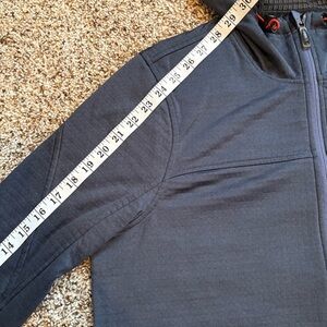 Full zip navy blue jacket with hood. Some piling shown in photos