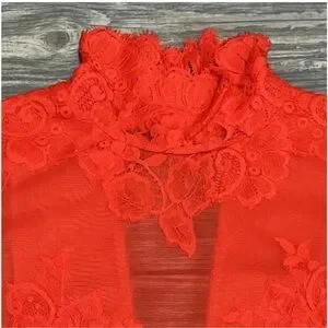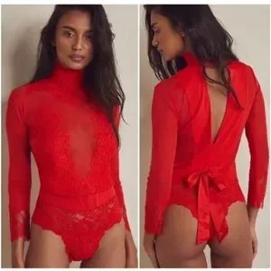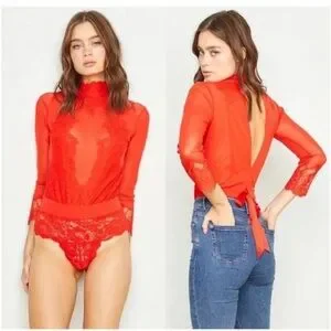 NWT $148 Free People Take HAH Bow Bodysuit Large Red Sheer Lace S L XL