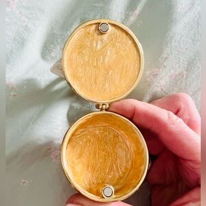 The hinged lid opens to a small compartment for storing small jewelry like rings or earrings.