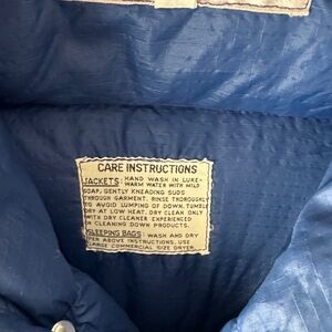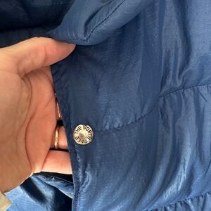 Gently Used Vintage The North Face Button Down Vest. This is a men's XL. Blue throughout with ripstop fabric. Front pockets. Cool The North Face text on the silver buttons. Care tag is gone but instructions reference a down fill.