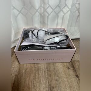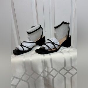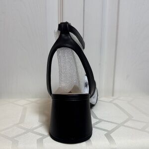 Stylish black block heels with strappy design. Ideal for versatile wear. 2.5 inch heel.