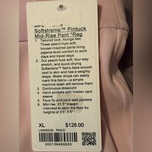 Lululemon Softstreme Pintuck Mid-Rise Pant tailored look, lounge feel. These peach-fuzz soft, trouser-inspired pants bring pajama-level comfort to work days and travel days. These peach-fuzz soft, four-way stretch, and quick-drying Softstreme fabric feels smooth next to skin and has a weighty drop.