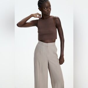 Pants in an airy, woven linen and viscose blend. High waist, waistband with concealed elastic, concealed button and hook-and-bar fasteners, and zip fly.