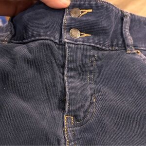 These corduroys are 98% cotton and 2% spandex so they have a bit of a stretch. Two buttons at the waist and a shirt zipper. Hugs all the right spots! Flare leg. No thigh wear and no wear at the hem of the legs from rubbing the ground.