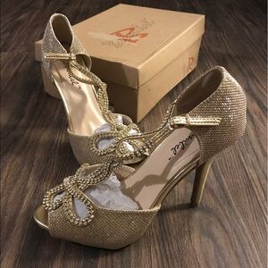 Step out in style with these stunning gold heels. Featuring intricate rhinestone detailing, these shoes are perfect for any special occasion.