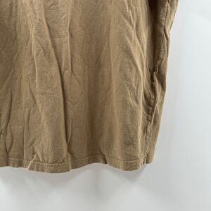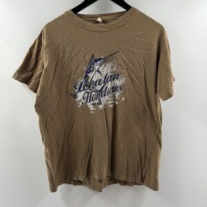 Brown graphic t-shirt featuring a Roatan, Honduras design with a swordfish graphic on the front. Classic short sleeve tee with a crew neckline and relaxed fit, making it comfortable for everyday wear. Great travel souvenir or casual graphic tee with a coastal, fishing-inspired vibe. Fabric has a soft, broken-in feel from normal wear. Overall good pre-owned condition with visible wrinkling from storage and normal wear consistent with age.