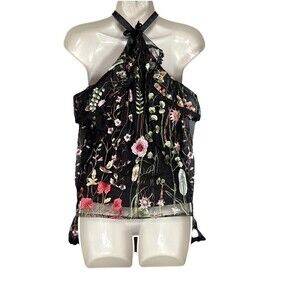 Persun Size M Black Mesh Long Sleeve Blouse Floral Embroidery Cotton Blend Lined