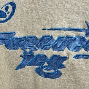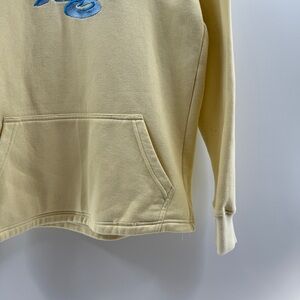 Forever Icy hoodie in a size medium, featuring a soft light yellow base with bold blue embroidered writing on the front and back, giving it a clean but eye-catching streetwear look. Designed with a classic hooded silhouette, drawstring hood, and front kangaroo pocket for everyday comfort. Please note there is some pilling present due to normal wear, which is cosmetic only and does not affect wearability. Still a solid, cozy piece with plenty of life left.
