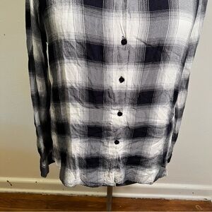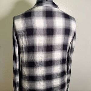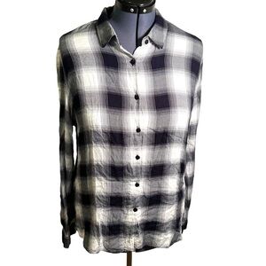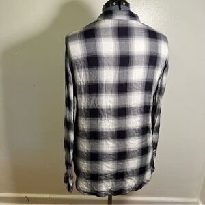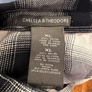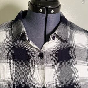 Great condition, minor wear. Chelsea & Theodore. Button down flannel shirt. Black and white plaid color. Long sleeve, roll tab. Style 884072481024. Size XL. 100% rayon. Pit to pit laying flat 22.5” shoulder to hem 27”/29” Sleeve (seam to hem) 26”. All measurements are approximate and taken lying flat. Smoke free home. No trades, offers welcome.