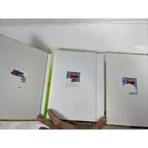 Three books have small name label stickers on the inside back covers, likely from a previous owner.