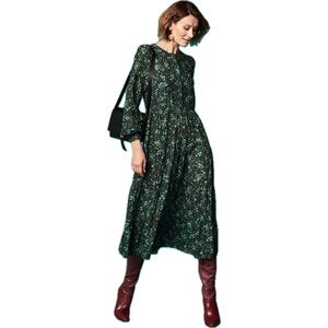 This dress can be worn throughout the seasons, super versatile, soft and flowing. Green & Black Floral Print. Round neck. Long sleeves with elastic cuffs. Gathered seam detail. Front hidden button closure. Midi Length. 100% Viscose