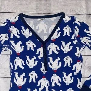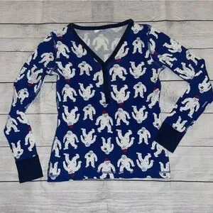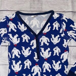 Adorable yeti print on soft navy fabric. Long sleeves and cozy fit. V neck.