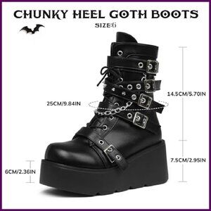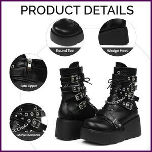 • Gothic Punk Style: Elevate your look with these goth boots, featuring a striking platform design and unique gothic details perfect for rave events and punk fashion statements.