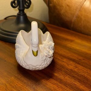 Vintage ceramic dish shaped like a swan with a gold accents. Ideal for decor or serving small items. So many uses. Planter, trinket dish, put it next to your sink to hold your scrubby. Put flowers or a small plant in it. So many options. It’s too cute.