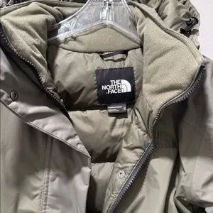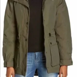 Warm and comfy North Face parka, perfect for cold and wet weather. Waterproof 550 fill down that doesn’t look like a puffer. Cinch at waist with side zippered pockets and front snap patch pockets. Zip away hood, Velcro cuff adjustments and center front snap placket and zip beneath.