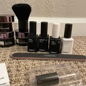 Includes 3-step liquid coats, brush saver, extra brush, powder brush, brand new filing board, build powder, 4 dip color powders, Bask LA e-file, e-file heads and replacement heads.