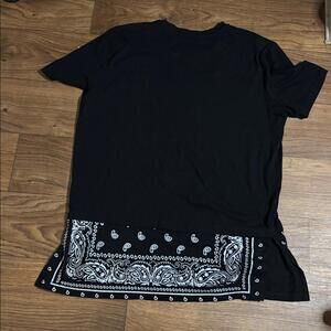 The narrows brand. Color: black, white. Crewneck and short sleeve shirt/shirt dress./Mini dress. It is a black cotton stretchy material with a black-and-white paisley print bandanna style bottom hem. The bandanna does have a slit on the side. Please see measurements depending how tall or short you are. It can be worn is either a shirt or a mini dress.
