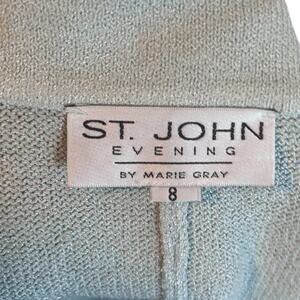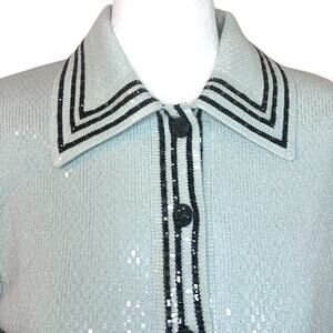 St. John Evening knit jacket in light blue with black trim and buttons. It is made from a wool blend material, commonly referred to as St. John's signature Santana knit.