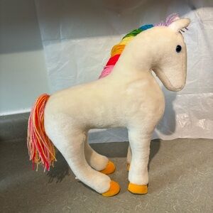 Beautiful vintage 1983 Starlite plush horse with a colorful flowy mane and tail. Soft white body and vibrant details. Perfect for playtime adventures. Great nostalgia for parents and a fun introduction to Rainbow Brite for children.