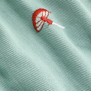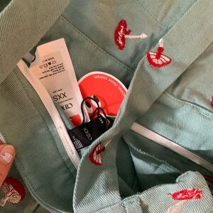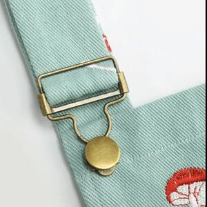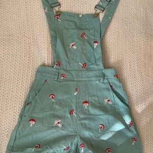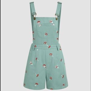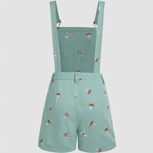 New with tags Cider overalls shorts in a dusty blue-green tone with all-over embroidered red mushrooms. Vintage-inspired fit with adjustable buckle straps, front pocket, and structured cotton feel. Super cute cottagecore / fairycore vibes.