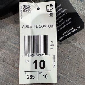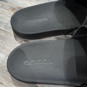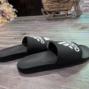 Sleek black Adidas slides. Features classic design and comfort. New with tags and never worn. Size 10 men’s.