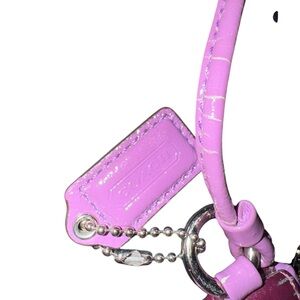 Vibrant magenta wristlet with embossed Coach Poppy design. Sleek and stylish for essentials.