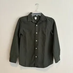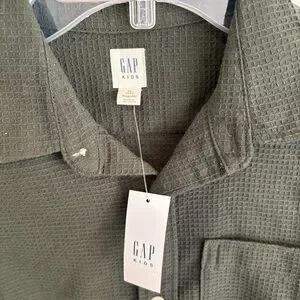 Green button-up shirt with waffle texture. Features a classic collar and front pocket.