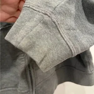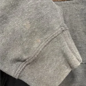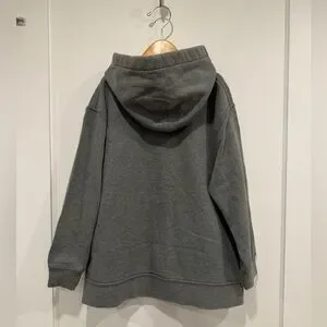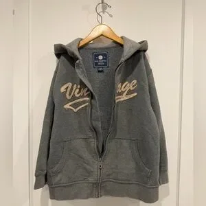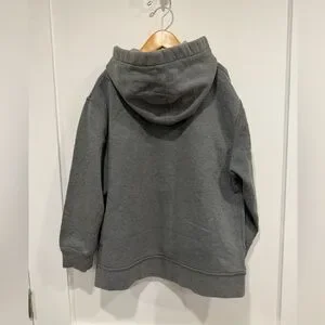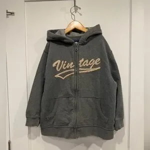 Well loved, fair condition, still lots of life in it. Cozy and stylish gray hoodie for kids. Features a zip closure and front pockets. Perfect for everyday wear. Vintage/distressed style cuffs show wear, some darker spots on sleeves.