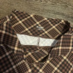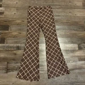 Stylish plaid flare pants with a brown and cream pattern. Perfect for a trendy look.