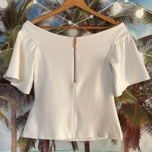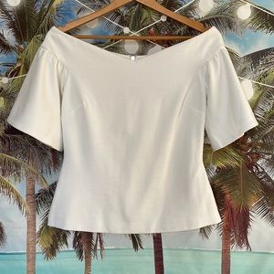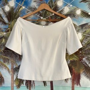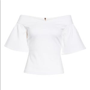 A sweetheart neckline falls off the shoulders into the sculpted sleeves that make this stretch-knit top a sophisticated way to play with volume. Exposed back-zip closure Off-the-shoulder neck Short flutter sleeves Lined 73% viscose, 23% polyamide, 4% elastane Hand wash, dry flat Imported Individualist