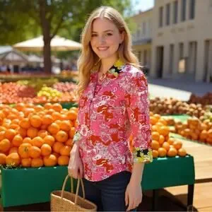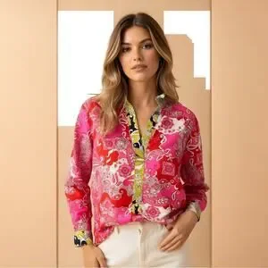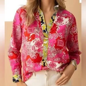 J. Crew NWOT hot pink paisley print tunic top; contrast paisley at neckline and cuffs; 5 button placket; three-quarter length sleeves