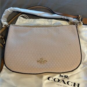 Elegant Coach shoulder bag with a beige checkered pattern. Stylish and versatile for any outfit.