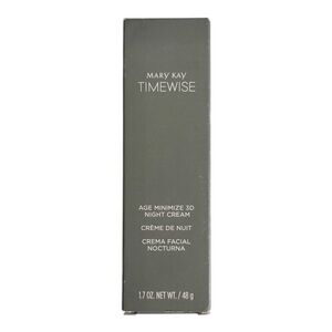 New in box Mary Kay Timewise Age Minimize 3D Night Cream 1.7 oz for Combination to Oily Skin. Features oil-free non-comedogenic formula with TimeWise 3D Complex to target fine lines and boost hydration. Enriched with glycerin and dimethicone for overnight moisture balance. Discontinued cult-favorite skincare item.