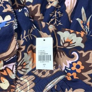 Stunning Anthropologie sleeveless floral mini dress in a rich navy colorway, size Large, brand new with tags (originally $178). Crafted from 100% cotton, this dress features romantic ruffled detailing, a flattering V-neckline with delicate embroidery, and a tiered A-line skirt that creates beautiful movement. A hidden side zip ensures a smooth, flattering fit. The navy base is accented with brown, pink, and soft yellow florals for an elevated, feminine look.