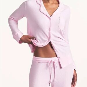 Soft and cozy pajama set. Button-up top with matching pants. Ideal for relaxing evenings. This is an unreleased color, model photos are in cherry blossom, actual photos show the product you will recieve.