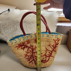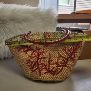 Vintage Woven Straw Raffia Purse Tote Bag Beaded Ocean Red Coral Beach 1970s
