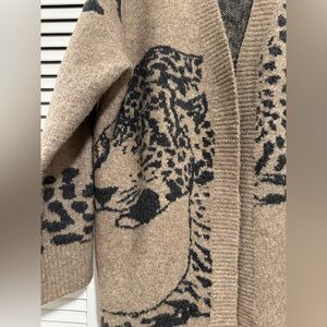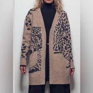 Show off your wild side with this bold jacquard cardigan, featuring a cozy knit and statement animal pattern—perfect for effortless layering.